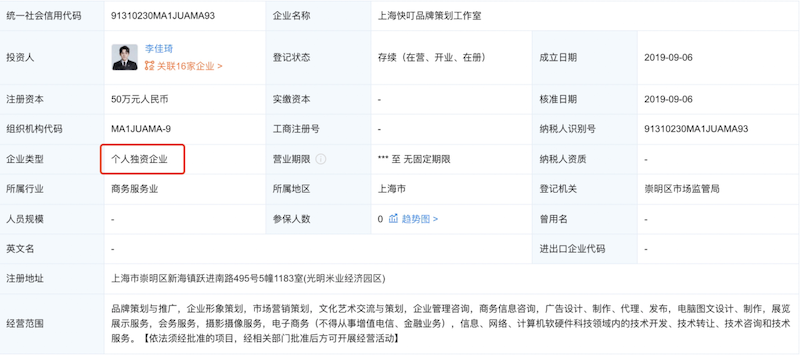 企查查数据显示,为了规范业务,同时也为了合理节税,李佳琦也成立了多家个人独资企业来对接承接广告及业务。