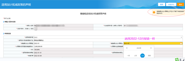 5. 在电子税务局“适用加计抵减政策声明”模块中提交2022年度适用15%加计抵减政策声明,当“销售额占比计算期止”选择“2022-12月”时,标黄并提示:销售额占比计算期止不应大于等于当前系统时间的年月?(如下图所示)